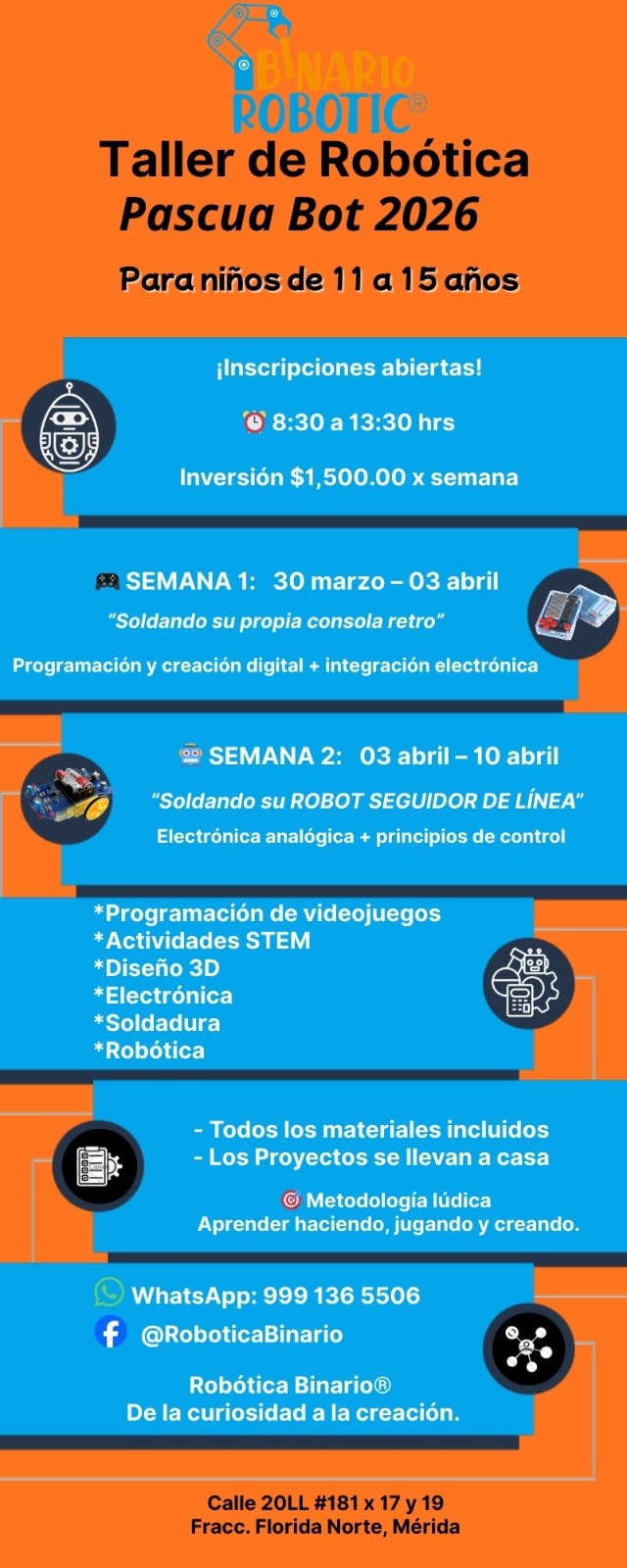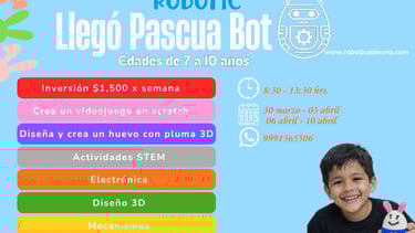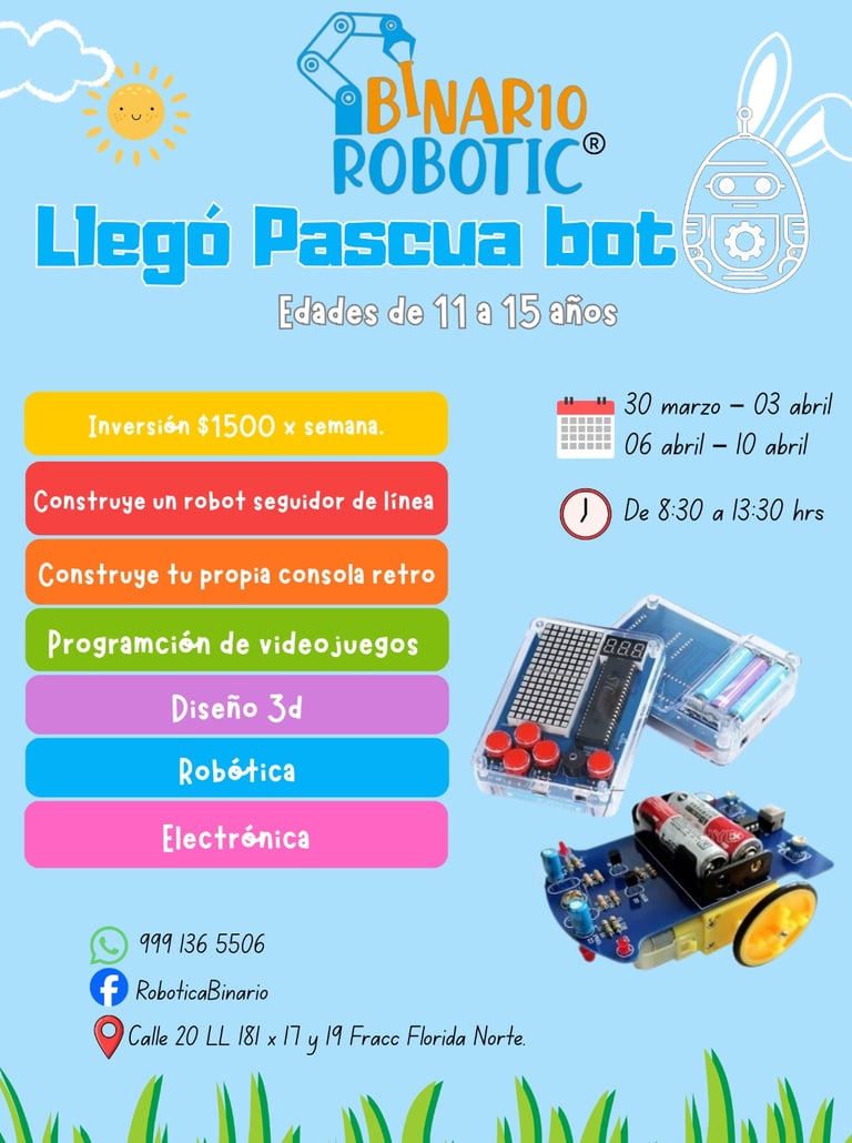 Durante estas vacaciones de Pascua, los niños y niñas podrán vivir una experiencia tecnológica única en el Hub de Exploración Tecnológica Binario Robotic. En este taller aprenderán construyendo y programando robots mientras resuelven retos divertidos que estimulan su creatividad, pensamiento lógico y confianza para crear tecnología.